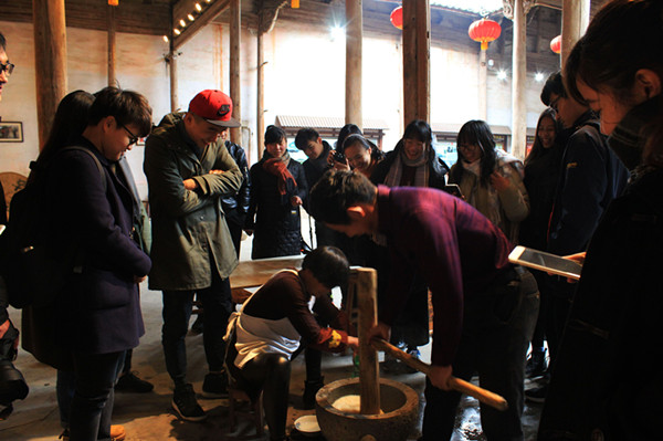 12月22日晚,学生们平安抵达寺平村。位于金华开发区汤溪镇的寺平村,始建于明代初期,距今已有700余历史。徽派建筑风格的古色古屋遍布全村,古砖雕工艺精美,古建筑保护完整,全村以七星伴月构建, 原有厅堂24座,现保存较为完整的厅堂还有8座。学生们入住“家+” 模式的村民家中,品尝汤圆,香糕等传统美食,与村民们一同体验富有特色的当地民俗。10月23日,学生们参观了寺平村,欣赏当地古建筑以及砖雕图集,听取了寺平村古建筑保护顾问胡阿荣老师的讲座,让学生第一次亲身感受到了徽派建筑的精美细致。讲座结束后,学生还参与了最富有当地特色的冬至习俗——打麻糍,一锤又一锤地将节日的祝福送至每个人的心中,欢声笑语也洋溢在村落的每个角落。